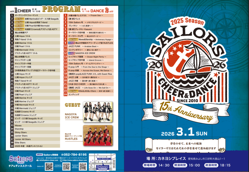 NEWS & BLOGお知らせ TOPIC 2026年02月10日 2026年02月09日 2026大会選抜チームトライアウト説明会3/7(土) VIEW ALL>> BLOG 2026年02月27日 年度末発表会2025プログラム 2026年02月10日 2026年02月09日 2026大会選抜チームトライアウト説明会3/7(土) VIEW ALL>>